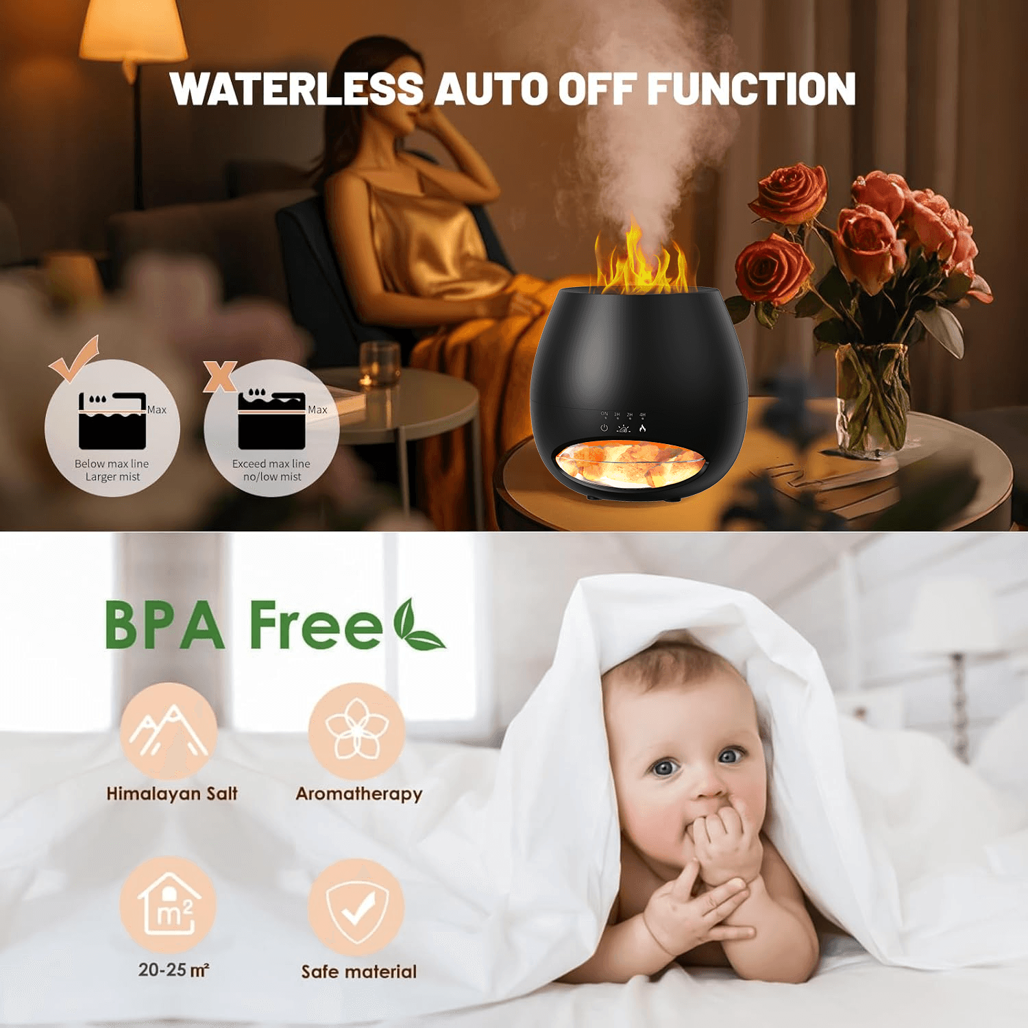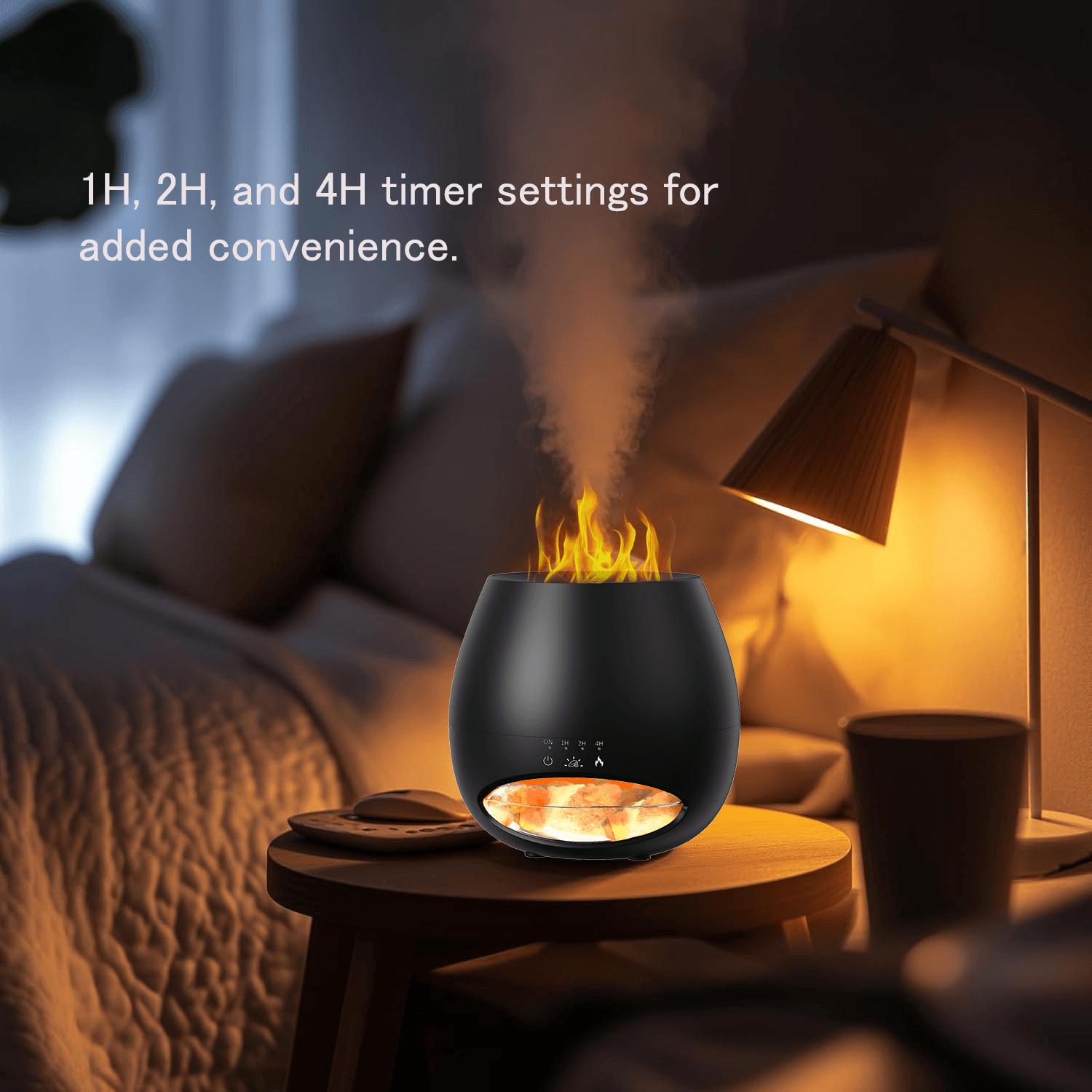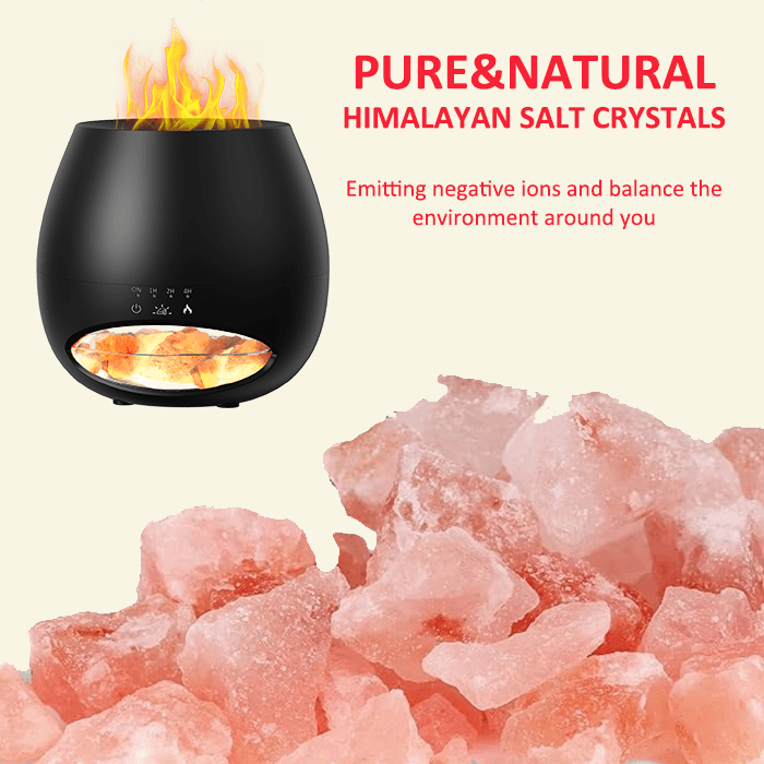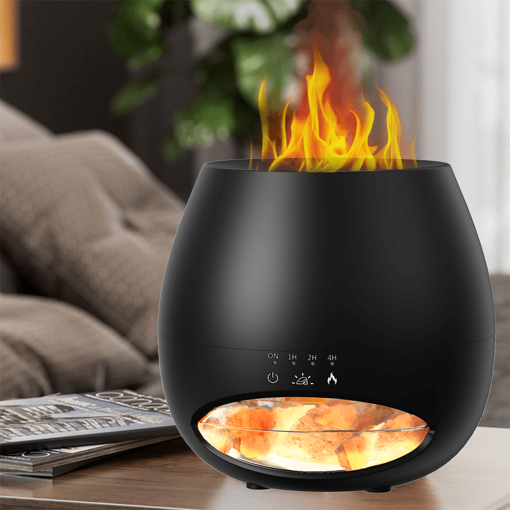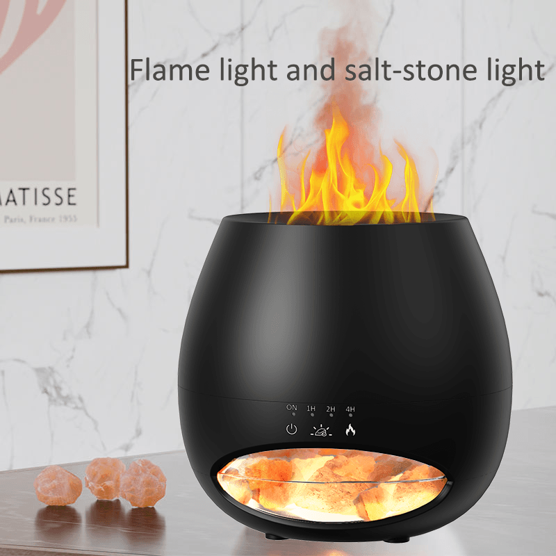 Black Color Salt Stone Flame Aroma Diffuser Ultrasonic Air Cool Mist Humidifier with Warm Light and Breathing Light Diffuser